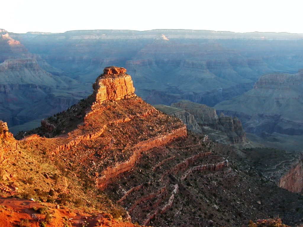 The South Kaibab Trail descending below O'Neill Butte. Skeleton Point, where the trail descends steeply down the Redwall, lies below.