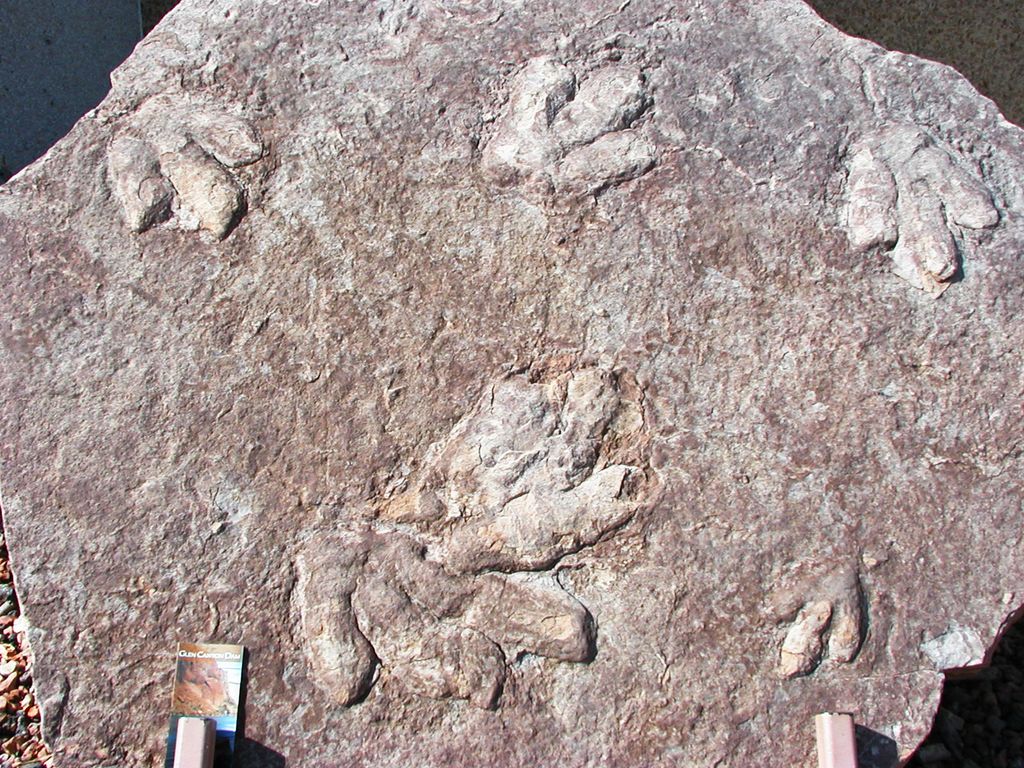 Displayed at Glen Canyon Dam vistor center are tracks of Dilophosauraus, a one ton, twenty foot long carnivorous dinosaur. These were preserved in Mesozoic Kayenta sandstone in the Glen Canyon area.