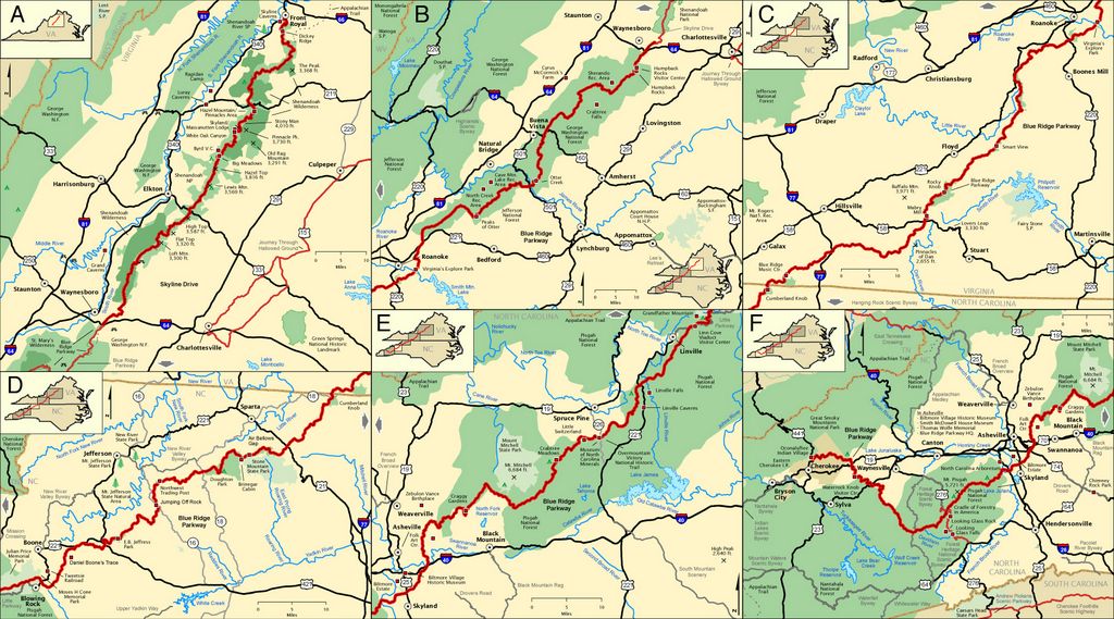 Skyline Drive and the Blue Ridge Parkway together are 574 miles (924 km) of some of the most scenic riding in the eastern US, and I am looking forward to it. Skyline Drive (A), completed in 1939, runs 105 miles (169 km) from Front Royal south to Rockfish Gap along the crest of the Blue Ridge Mountains in Shenandoah National Park, Virginia. The Blue Ridge Parkway (B to F) continues south another 469 miles (755 km) along the Blue Ridge to the Cherokee Reservation and Great Smoky Mountains National Park in North Carolina. Work on the Parkway began in 1935, but was not completed until 1987. Maps from Byways.org.
