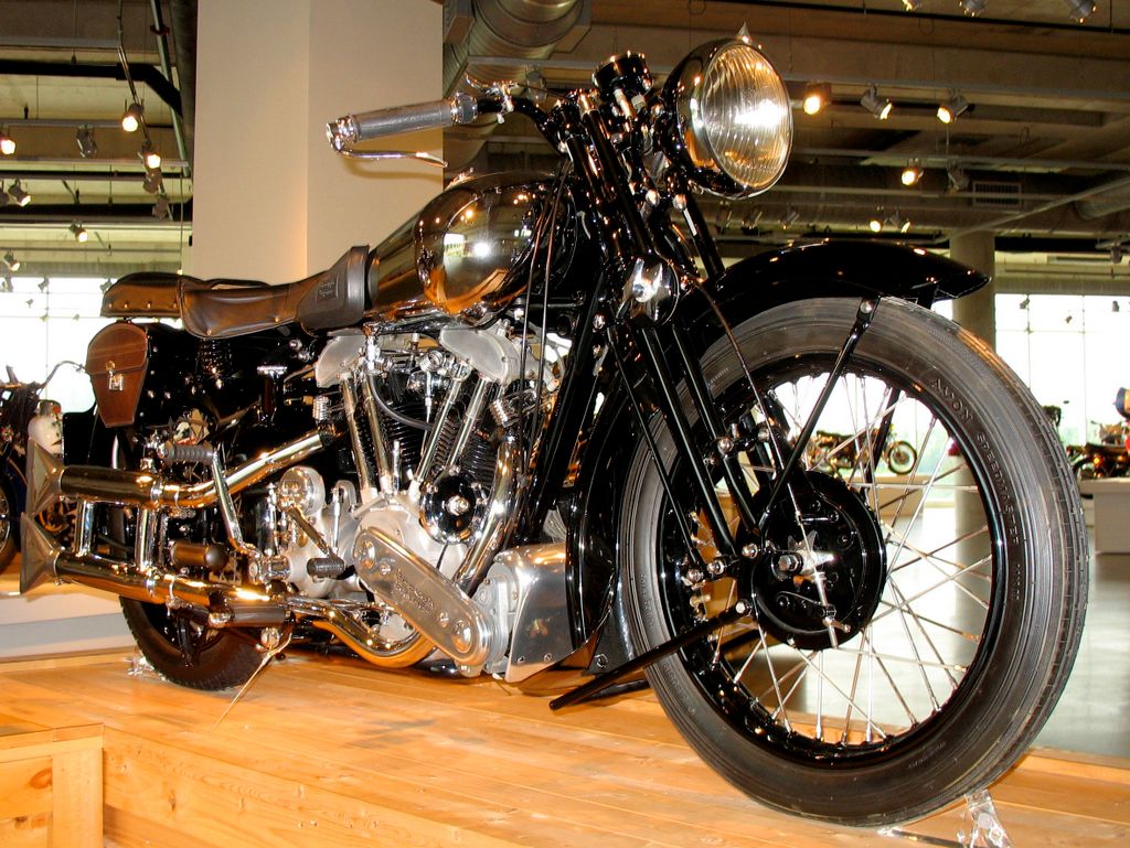 1938 Brough-Superior SS100 (Great Britain). 981 cc air-cooled 50 degree V-twin four stroke, Norton four speed transmission. Top speed 100 mph. Brough-Superiors (pronounced "bruf"), advertised as the "Rolls-Royce of motorcycles", were assembled from high quality parts from various manufacturers. T.E. Lawrence (of Arabia) owned five of these expensive machines during his lifetime.