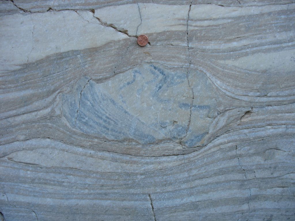 This boudin shows internal brittle failure in contrast to the ductile matrix.