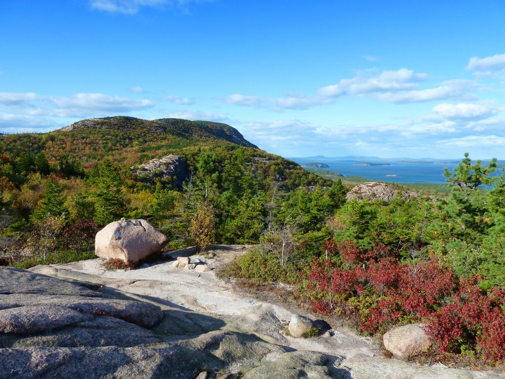 View from the Beehive to Champlain Mountain, Acadia National Park, Maine. The bedrock here is Cadillac Mountain Granite, a distinctive pink feldspar and quartz rich rock.