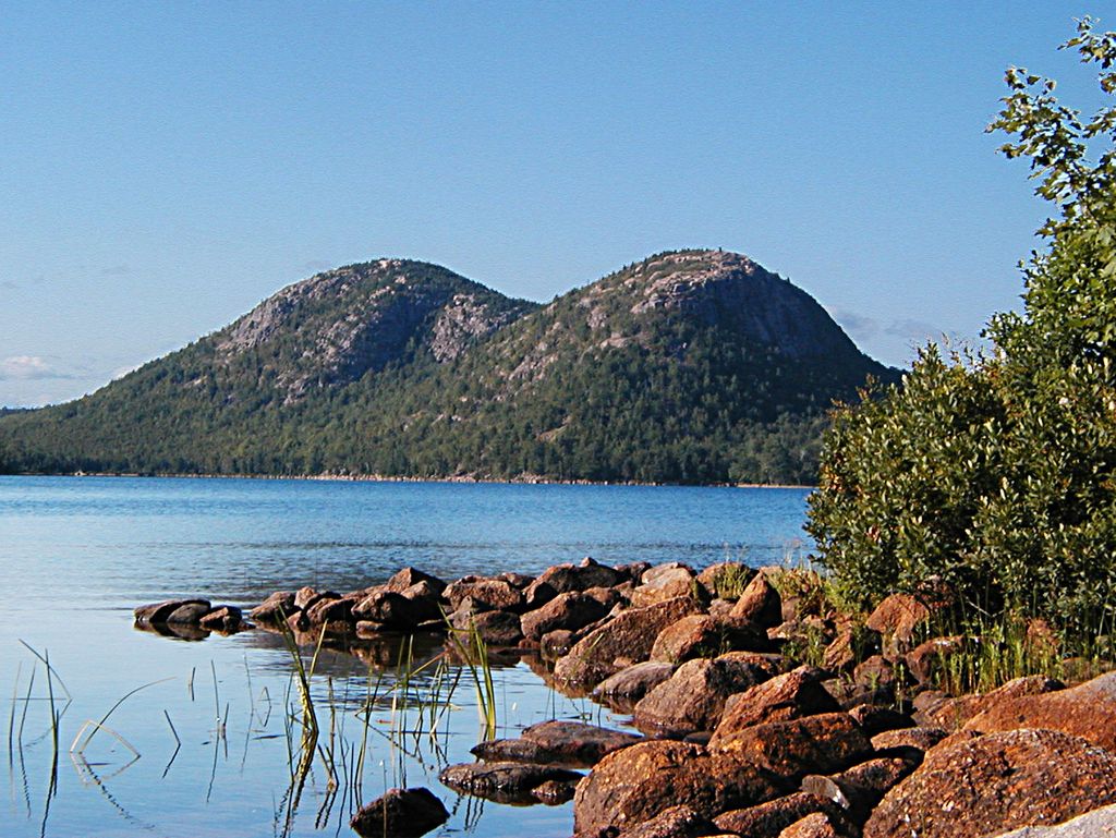 The granite Bubbles over Jordan Pond were sculpted by glacial ice. A large glacial erratic is perched near the summit of South Bubble, at right.