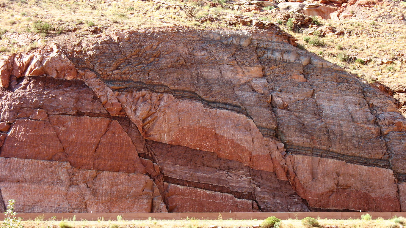 Small normal faults associated with the Moab Fault, which is to the right. Arches National Park, Utah.