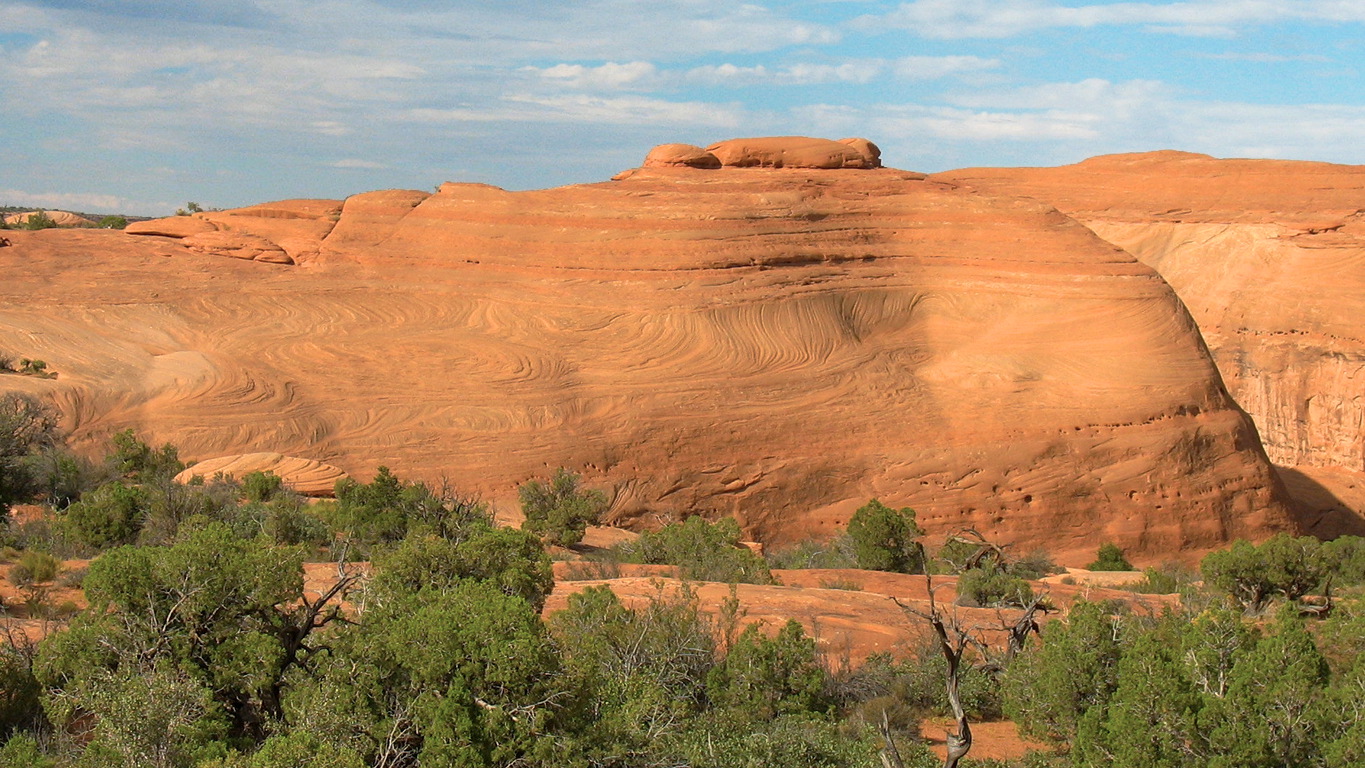 Crossbeds in the Navajo sandstone formed in Mesozoic sand dunes. Most of the arches form in the overlying Entrada sandstone.