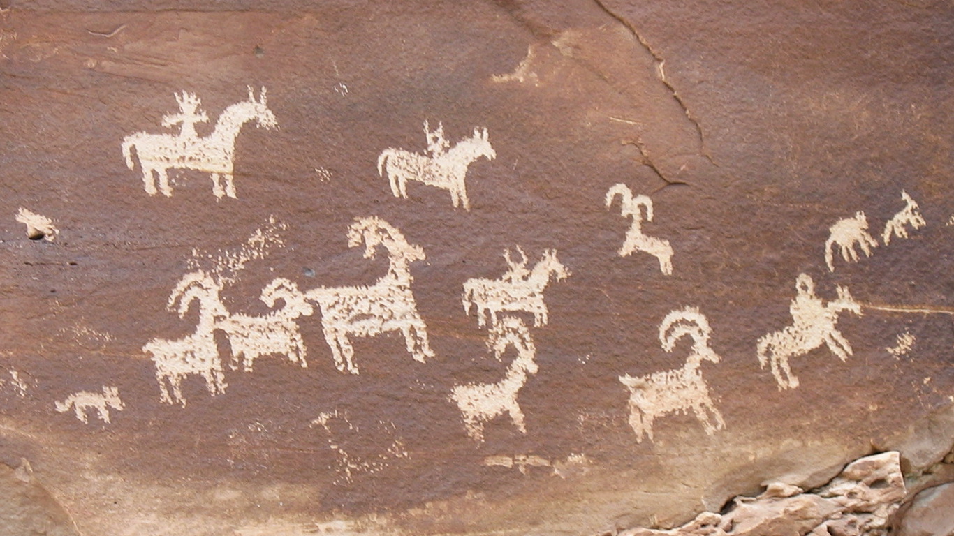 Ute petroglyphs, carved between 1650 and 1850, show stylized horses and riders surrounded by bighorn sheep and canines.