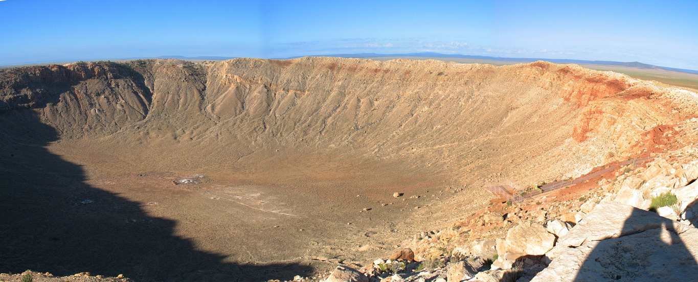 The 1240 m (4100 ft) wide crater, blasted into horizontal strata of the Cororado plateau, was created about 50,000 years ago by the impact of an iron rich meteorite thought to have been 130 feet in diameter, and traveling at about 12 kilometers per second (26,800 mph).