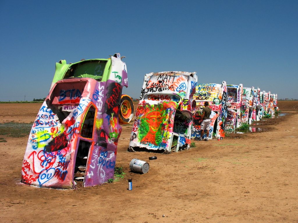 Cadillac Ranch outside of Amarillo, Texas. Graffiti is actually encouraged, and is part of the intent of the display, a public art sculpture installed in 1974.