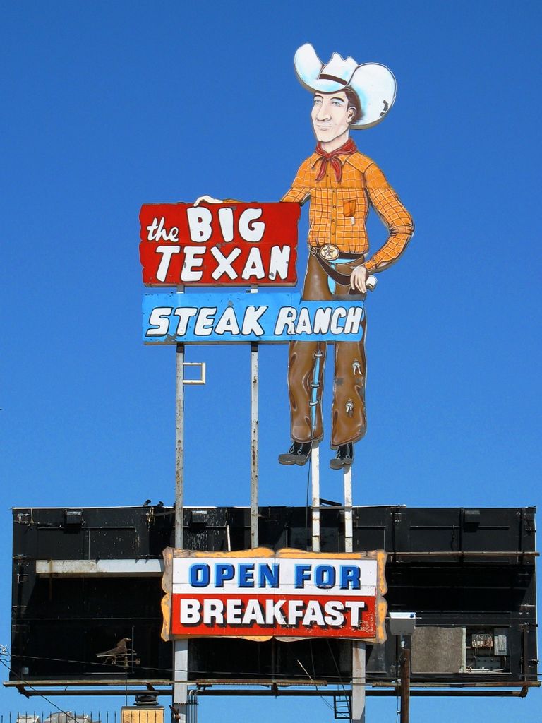 The Big Texan in Amarillo. I ate here in the early 1970's during a 36 hour coast to coast drive. They still have free 72 ounce steaks, if you can eat one in an hour.