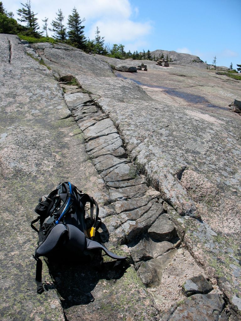 One of the many diabase dikes cutting the granite. The more abundant fractures in the dike illustrate their different mechanical properties.