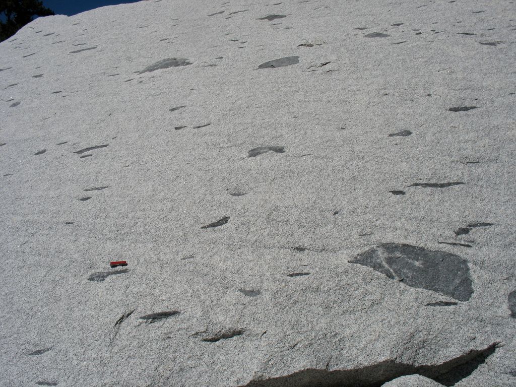 Mafic inclusions and rhythmic banding in granitic rock. Granite, granodiorite, and related rocks of the Sierra Nevada Batholith are the main rocks exposed Yosemite National Park.