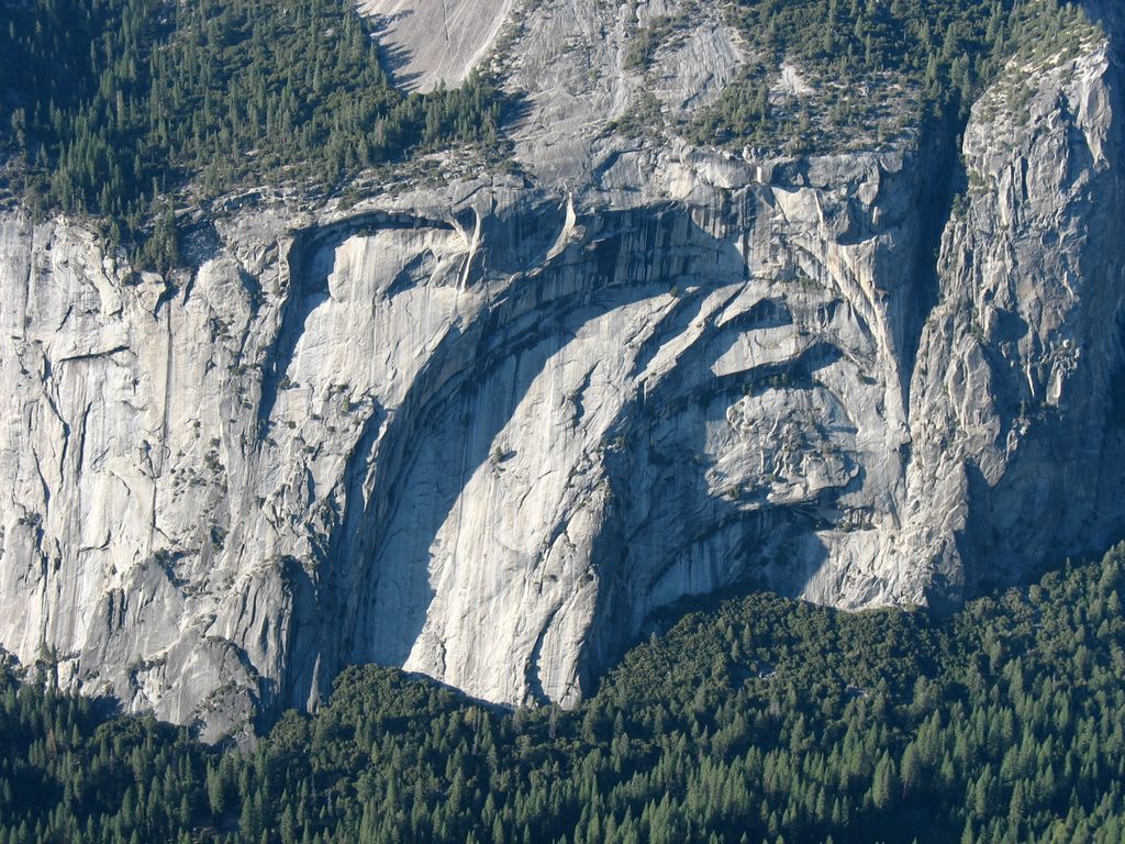 Royal Arches. While camped in the backpackers' camp in the woods below, rockfall thunders down the narrow chute just right of the arches.