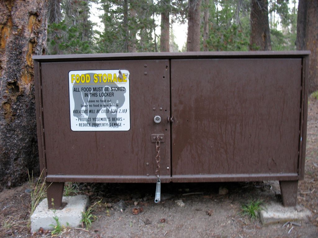 The food storage lockers here are sophisticated, this one requires inserting a wrench to lock the interior deadbolt. Approved bear resistant cannisters are required for backcountry travel, and add three pounds to pack weight.