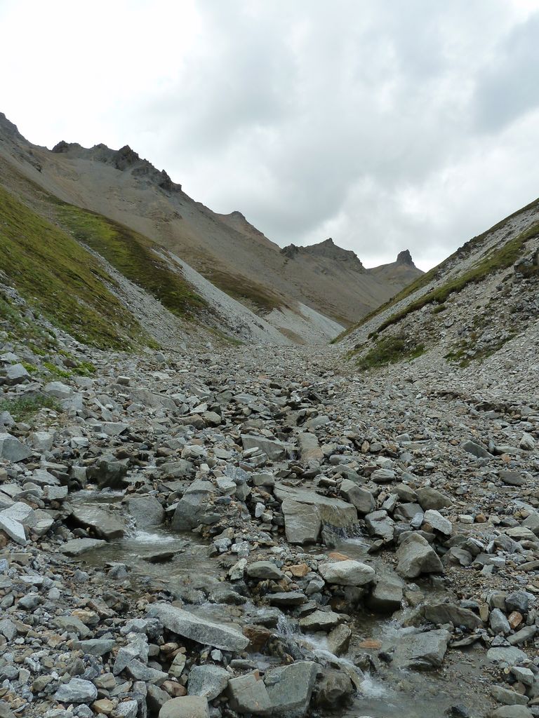 Leaving the main valley, I follow a rocky chute to the col where I hope to camp.