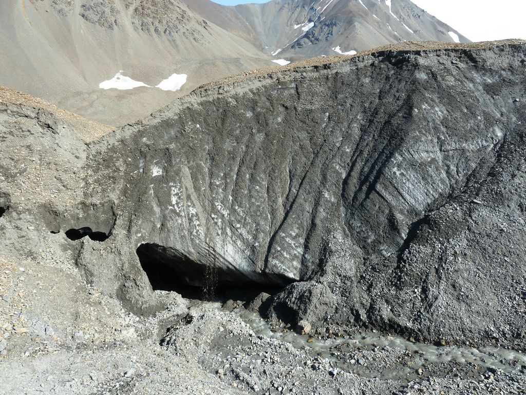 I then encounter an ice wall with an exposed tunnel, partially hidden by a veneer of till. This is a dead end on the wrong side of the valley, and I am now not sure I will make the pass.