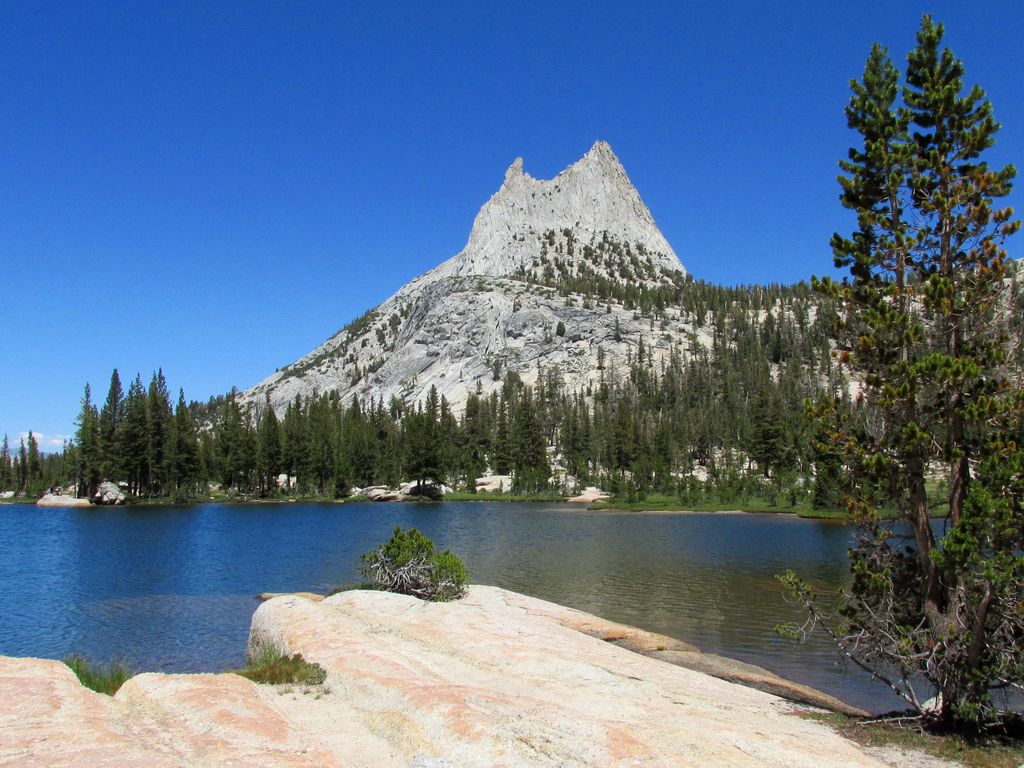 Cathedral Peak from Upper Cathedral Lake. Camp 2 is made in Tuolumne Meadows this evening.