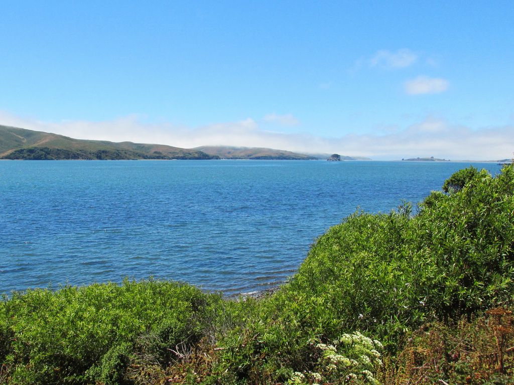 Tomales Bay, which separates the northern part of Point Reyes from the mainland, is the surface expression of the San Andreas Fault, a tectonic plate boundary. The Pacific Plate, across the bay, is moving about 3 cm per year to the north with respect to the North American Plate, on which I am standing.