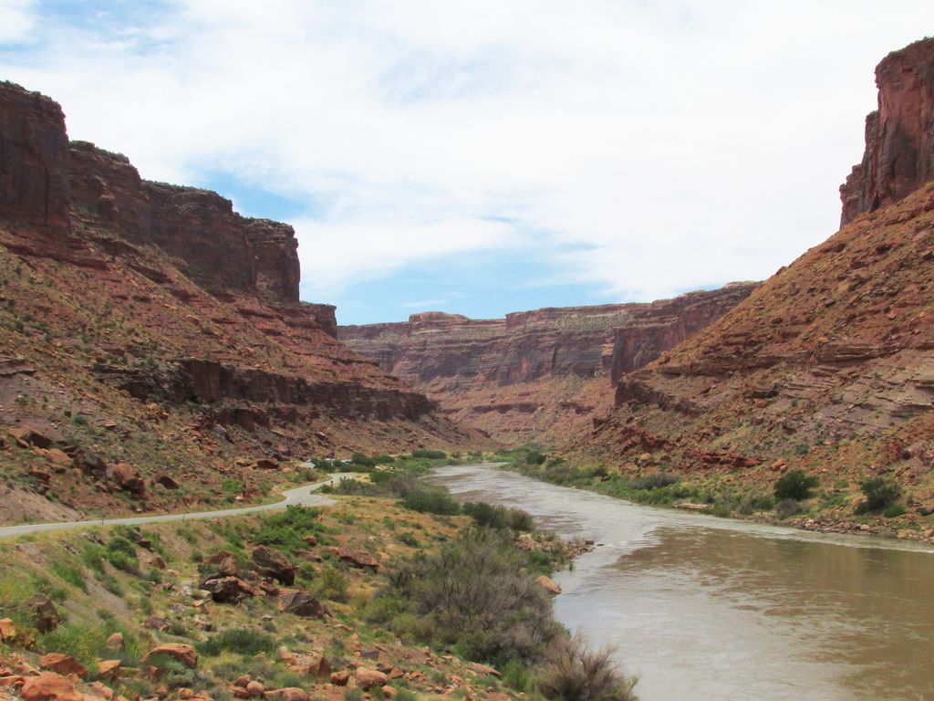 The road descends following the Colorado River, climbing back near Moab.