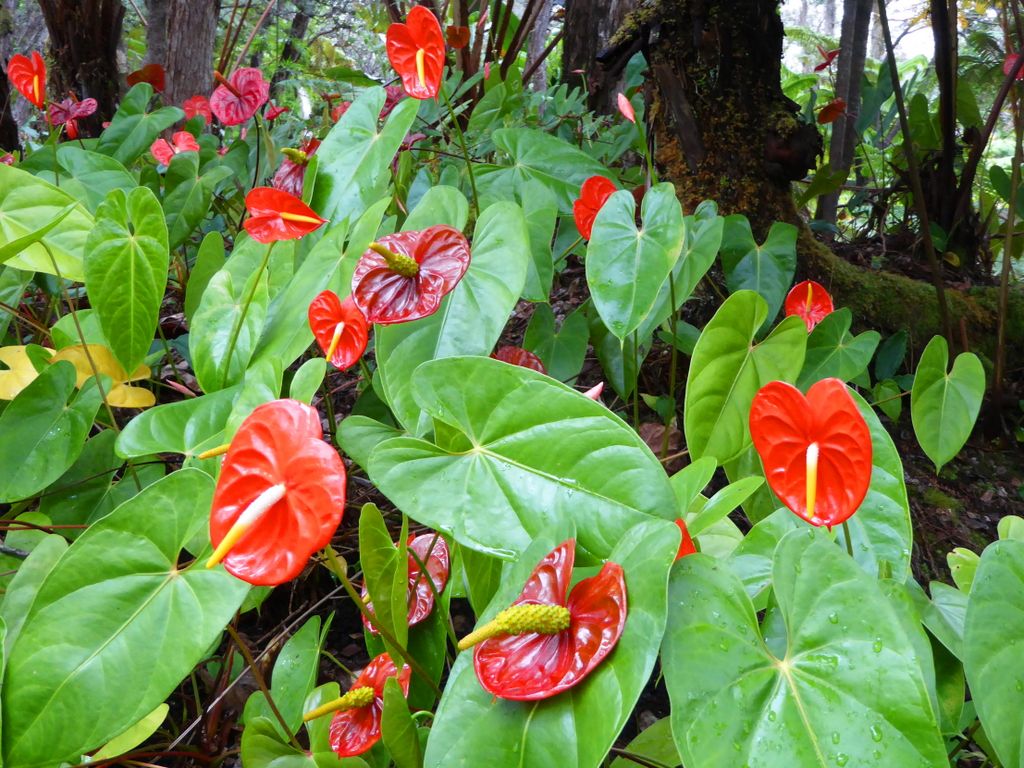 Bright red Anthurium flowers decorate our room and dinner table. In a vase, the waxy flowers can be mistaken for artificial.