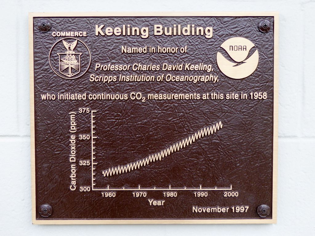 A plaque commemorates the naming of the original building in honor of Dr. Charles David Keeling, who initiated the monitoring of CO2 levels here in 1958.